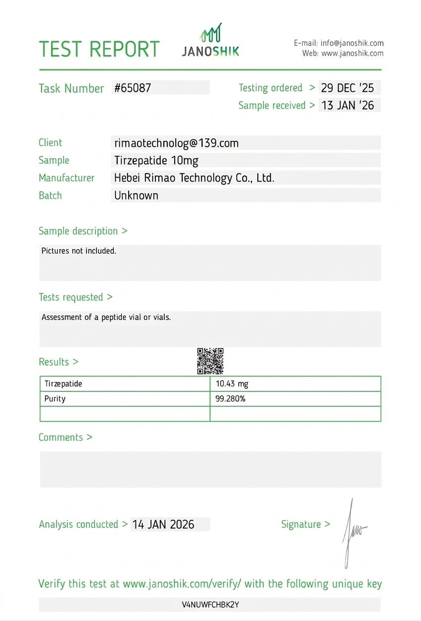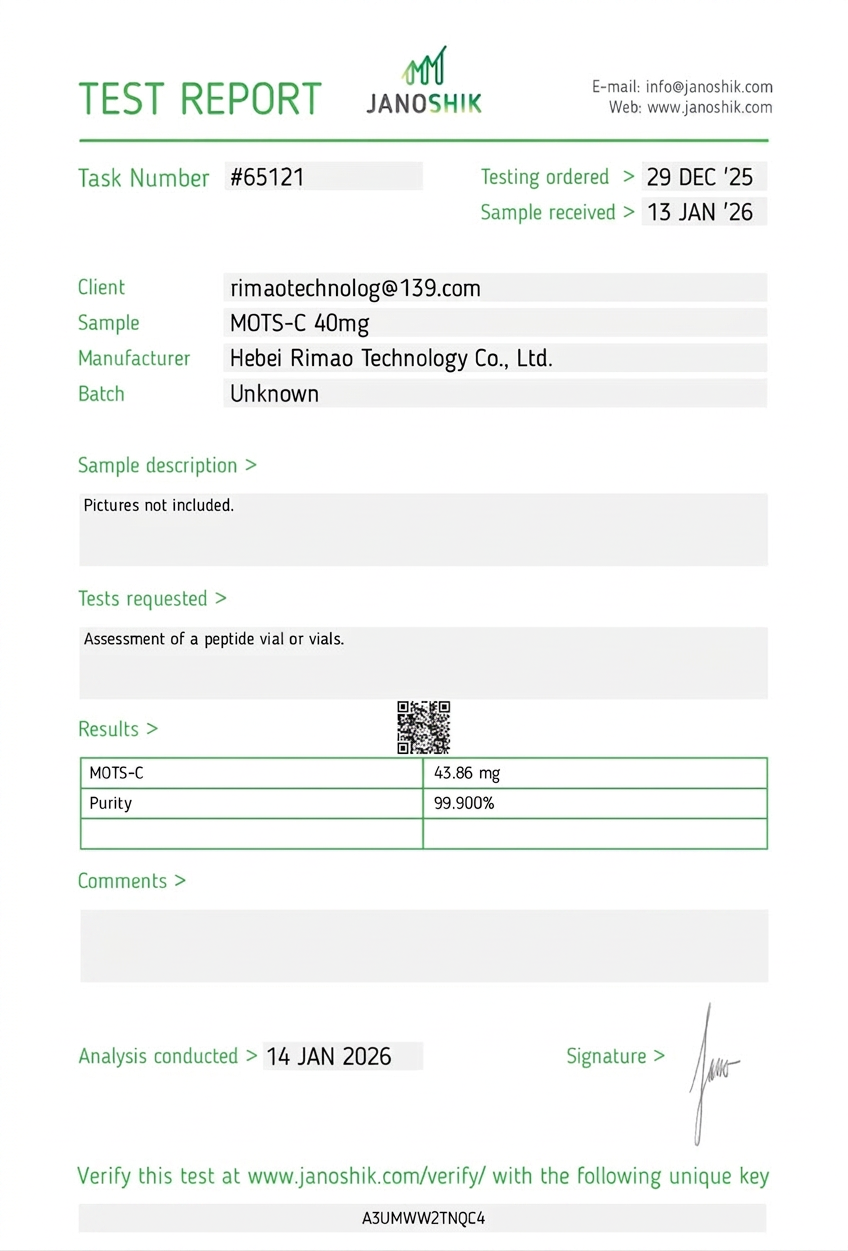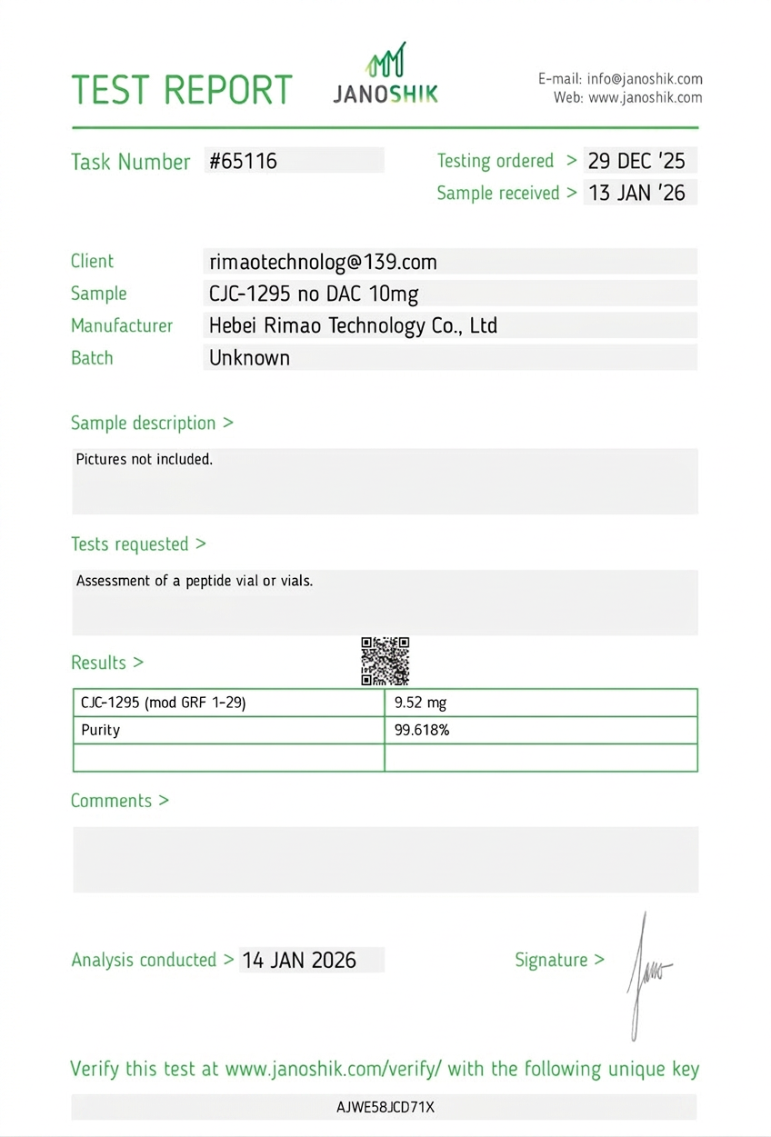 Every batch is independently tested by Janoshik Analytical, a third-party laboratory with no commercial interest in our products. Each certificate includes HPLC purity analysis and mass spectrometry identity confirmation.